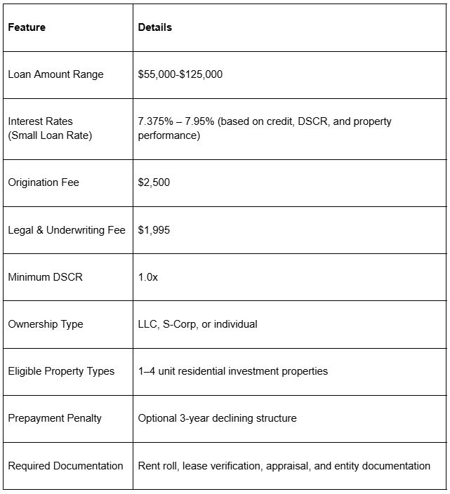 For most investors, the biggest roadblock with small-balance properties is finding a lender willing to finance it. While DSCR loans are designed to make qualifying easier, most lenders simply won’t issue them for amounts between $55,000–$99,000.